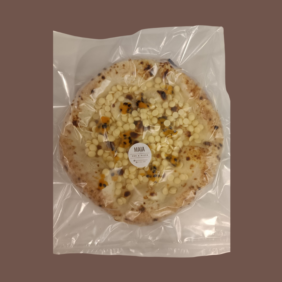 Nossa pizza doce de geleia de maracujá com chocolate branco é a combinação perfeita de leveza e sabor. Feita com farinha italiana e fermentada por pelo menos 24 horas, nossa massa tem uma textura leve e aerada, garantindo a base ideal para essa experiência irresistível.