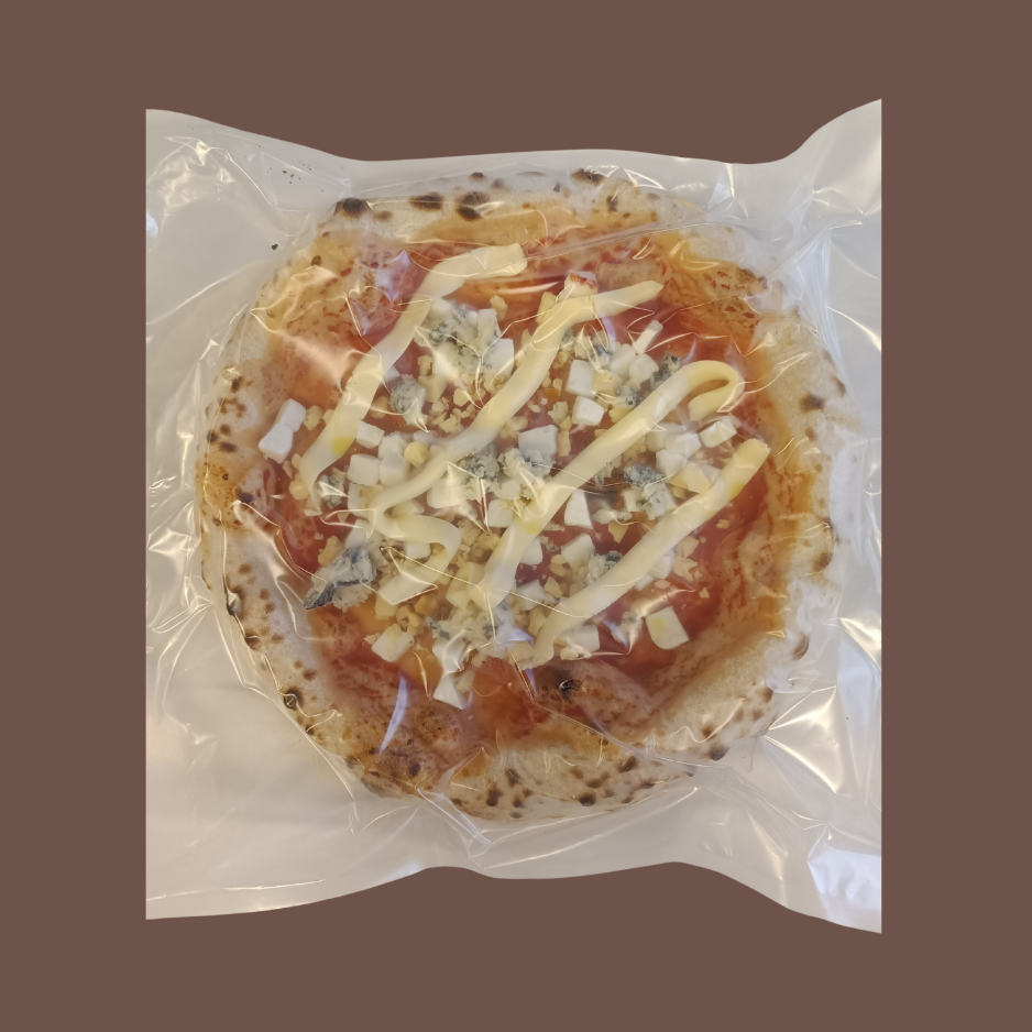 Nossa pizza Quatro Queijos congelada é preparada com uma massa especial, feita com farinha italiana e fermentada por mais de 24 horas, resultando em uma base leve e saborosa. O molho de tomate, importado diretamente da Itália, traz equilíbrio e realça a intensidade dos queijos selecionados.
